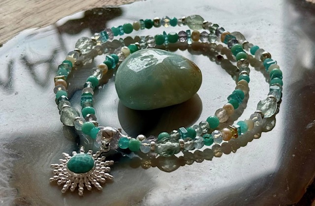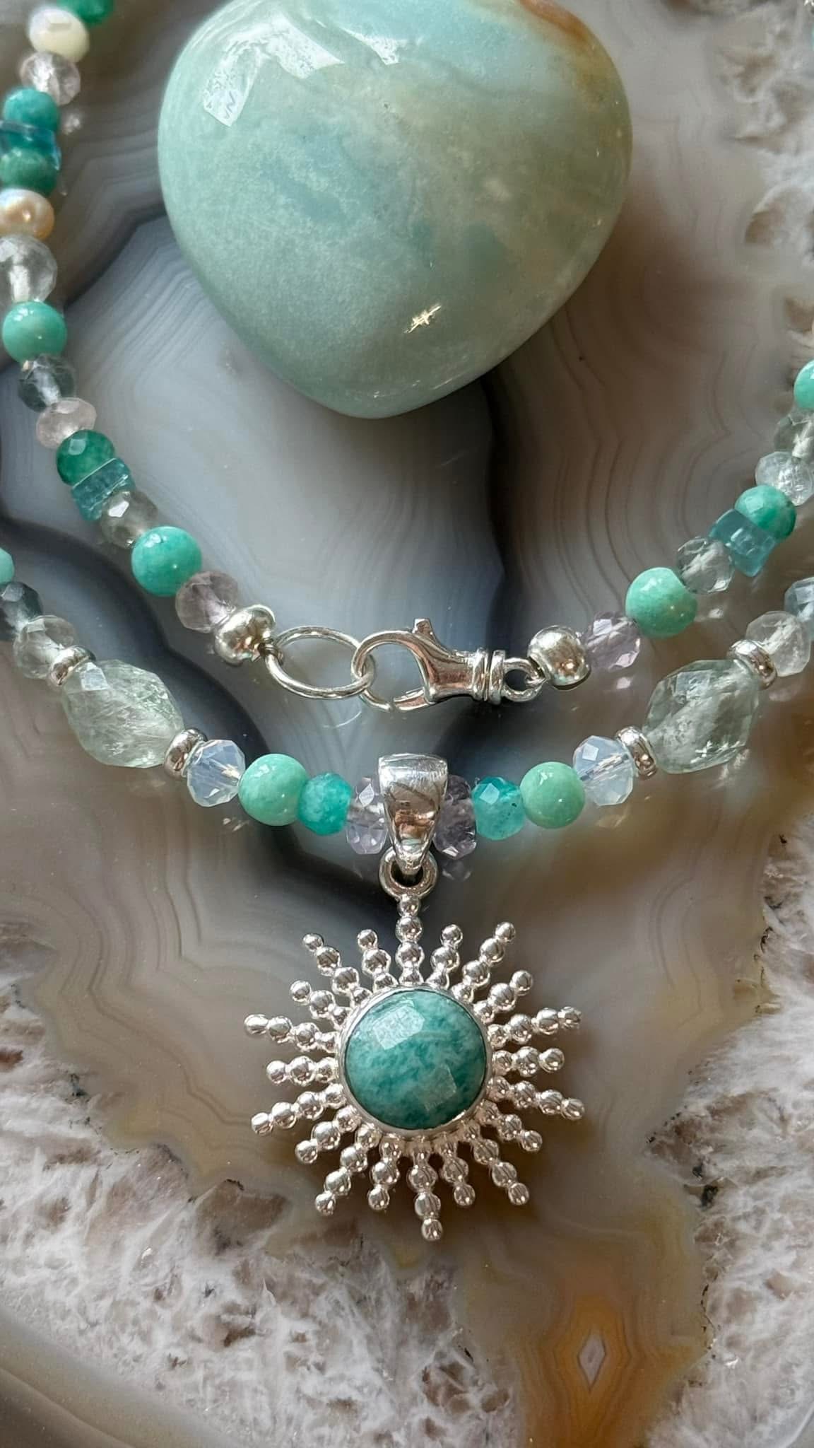 Die Halskette ist 43cm lang und mit 925 Silberteile und Anhänger (Amazonit)bestückt
